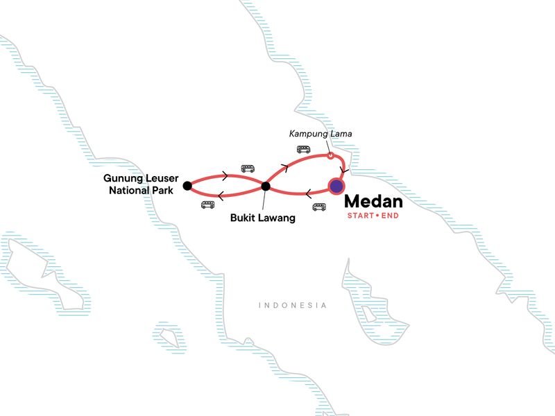 Your Foodie Moment: Padang Lunch, Medan. Guided Medan city tour with Becak. Epic jungle trek in search for orangutan. Camping inside Gunung Leuser National Park. River tubing. Kampung Lama cultural immersion experience. All transport between destinations and to/from included activities.