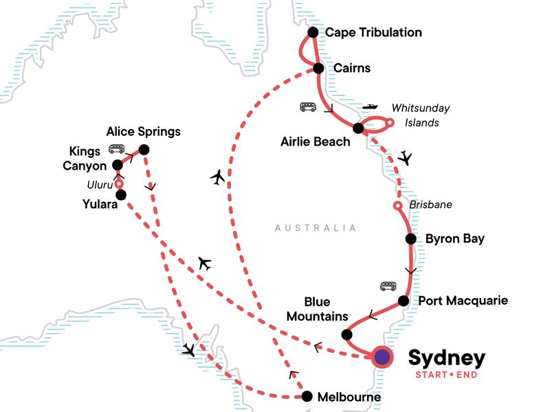 Your Welcome Moment: Welcome Moment - Meet Your CEO and Group. Melbourne laneways walk. Guided walk at Uluru - Kata Tjuta National Park. Sunset at Uluru. Guided Hiking at Kings Canyon. Visit to Telegraph Station. Ferry to Manly Beach. Visit to Victoria Market. Visit to Royal Botanic Gardens of Melbourne. Guided Daintree Rainforest walk. Whitsunday Islands boating excursion. Blue Mountains stay with hikes. Scenic Railway. Orientation walk in Sydney. Free time in Cairns, Byron Bay, and Sydney. Internal flights. All transport between destinations and to/from included activities.