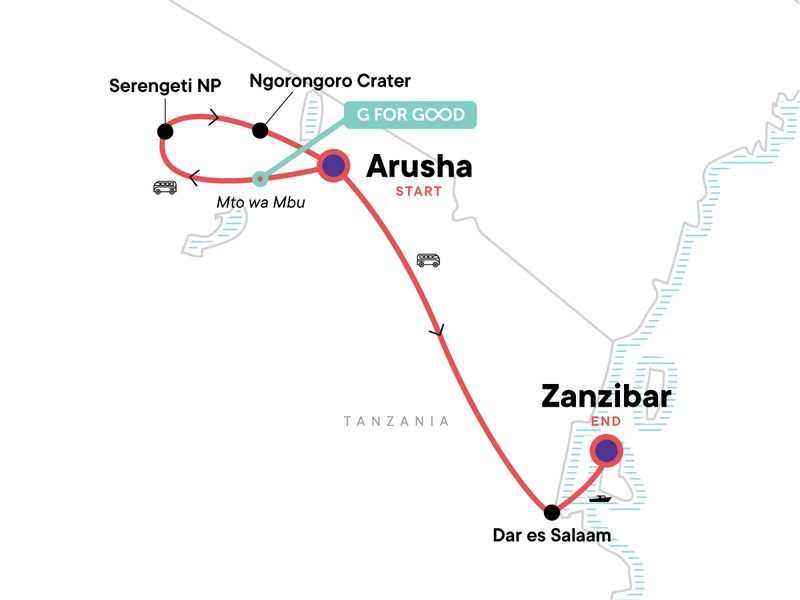 Your Welcome Moment: Welcome Moment - Meet Your CEO and Group, Arusha. Entrances and wildlife safari drives in Serengeti National Park and in Ngorongoro Crater. Ferry to Zanzibar. Stone Town orientation walk. Beach time in Zanzibar. All transport between destinations and to/from included activities.