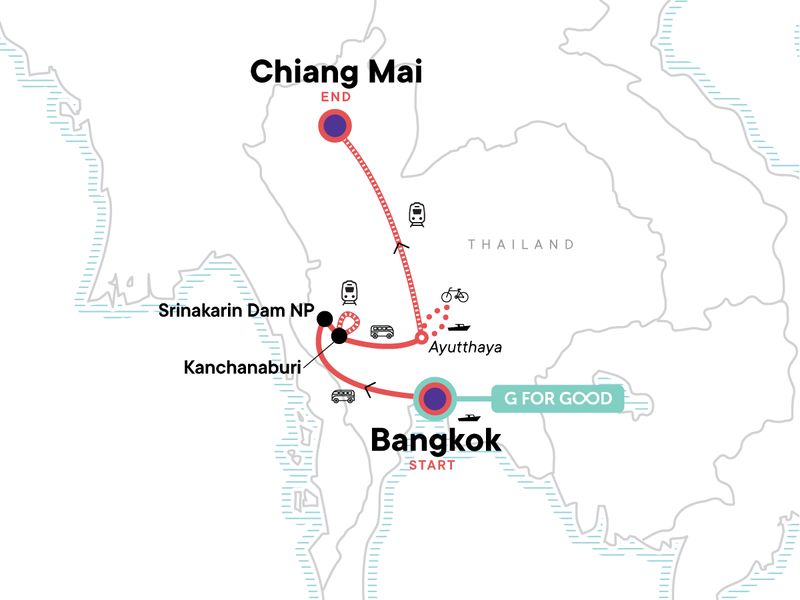 Your Foodie Moment: Street Food Dinner in Chinatown, Bangkok. Bangkok Klong Riverboat Tour. Visit Hellfire Pass and Ride the Death Railway. Visit Bridge on the River Kwai and Thai/Burma Railway Centre and Allied War Cemetery. Visit a Local Rice Farm. Ayutthaya Cycling. Boat Tour. Chiang Mai Old Town Orientation Walk. Chiang Mai Night Market Walk. Sunrise Alms Giving. Doi Suthep Temple Visit. All transport between destinations and to/from included activities.