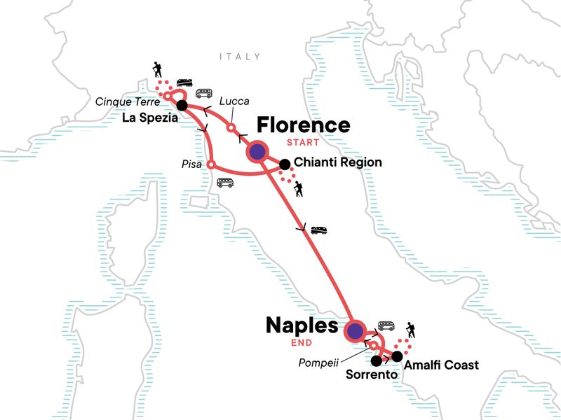 Your Foodie Moment: Limoncello Tasting, Sorrento. Orientation walking tour of Naples, Florence, and Sorrento. Visit to Cinque Terre National Park. Wine tasting at agriturismo. Orientation walk in Sorrento at night. Limoncello tasting. Free time in Florence, Cinque Terre, Pisa, Sorrento, and Naples. Cinque Terre park fee, unlimited train ticket and CEO-led hike. Lucca Guided Walking Tour. Path of the Gods hike along the Amalfi Coast. Pompeii Guided tour. All transport between destinations and to/from included activities.