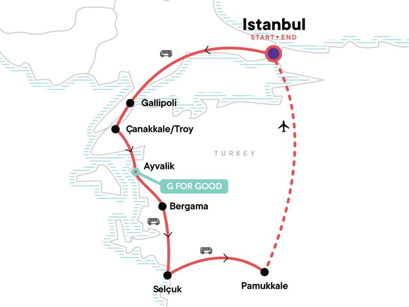 Your Welcome Moment: Welcome Moment - Meet Your CEO and Group. Gallipoli battlefields entrance and guided visit. Troy entrance and guided visit. Ephesus entrance and visit. Ancient Hierapolis and Pamukkale entrance and guided walk. Istanbul city walking tour. Internal flight. All transport between destinations and to/from included activities.