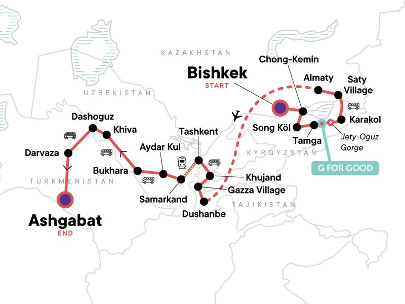 Your Local Living Moment: Overnight in a Yurt, Aydar Kŭl Camp. Bishkek City Tour. Burana Tower. Home-cooked traditional dinner. Overnight in a Yurt. Free time in Chong-Kemin. Song Kul Lake. Lunch with Local Family in Kochkor. Skazka "Fairytale" Canyon. Tamga Village Stay. Yurt Building Demonstration. Jety Oguz & the Seven Bulls. Karakol City Tour. Russian Orthodox Cathedral. Dungan mosque. Saty Village Stay. 4x4 ride to Kaindy Lake. Charyn Canyon. Almaty City Tour. Independence Square, Zenkov Cathedral, Panfilov's Park. WWII memorial. Free time in Almaty. Dushanbe City tour. Alexander the Great's lake. Hike to Iskander Darya waterfall. Fann Mountains. Voru Village Hike and Blacksmith. Free time in Ghazza Village. Istaravshan Mosque and Lenin Bust visit. Khujand City Tour. Museum of Sughd. Mausoleum of Sheik Muslekheddin. Khujand market. Amir Timur Mausoleum Visit. Samarkand City Tour. Shaki Zinda complex, the bazaar, Bibi Khanum, and Registan Square. Free time in Samarkand. Chashma Complex and Holy Spring Visit. Fortress of Alexander the Great Visit. Aidarkul Lake. Authentic Uzbekistan dinner. Evening Kazakh singing show. Overnight in a Yurt. Free time in Bukhara. Bukhara City Guided Tour. UNESCO-listed Khiva Ancient City Exploration. Free time in Khiva. UNESCO World Heritage Site Kunya Urgench. Guided tour of Dashoguz City. Gorogly Monument. Dashoguz Wedding hall. Kara-Kum desert. Fiery Darvaza gas crater, "Gates of Hell”. Mud Crater Visit. Sand Dunes of Karakum Desert. Ashgabat City Tour. Monument of Independence. National Museum of History and Ethnography. Arch of Neutrality. Gulistan market. Ancient Settlement of Nisa. Free time in Ashgabat. Tashkent Guided City Tour. Free time in Tashkent.