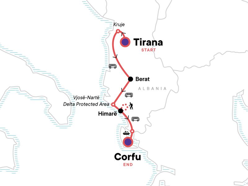 Your Big Night Out Moment: Corfu. Orientation walk of Tirana. Explore Kruje on foot. Walking tour of Berat including the castle. Visit the coastal wetlands of the Vjosë-Nartë Delta Protected Area. Walking tour of Himarë. Transport to/from all included activities and between all destinations.