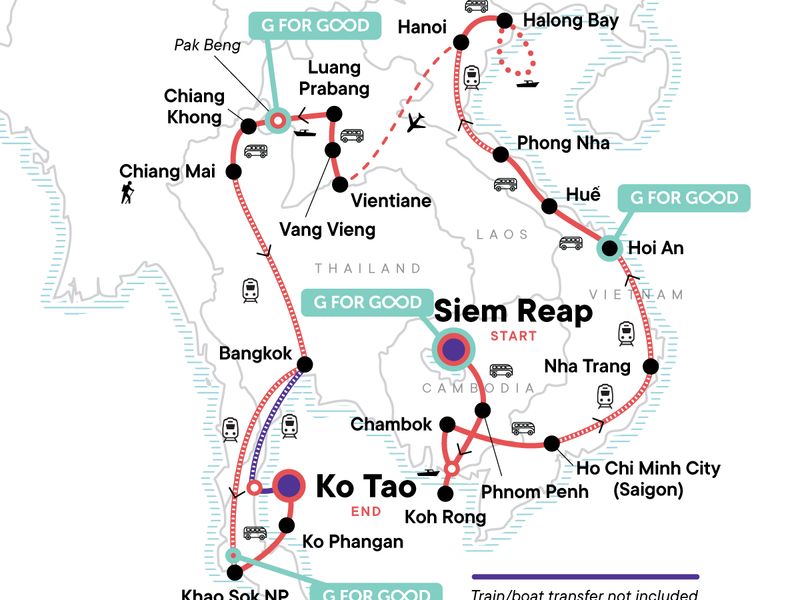 Your Big Night Out Moment: Beach Bar, Koh Tao. Guided sunrise tour of Angkor Wat temple complex. Traditional meal at the G Adventures-supported New Hope project or in a local home in a nearby village. Local living moment at Chambok Homestay including dinner. Orientation walks in Phnom Penh, Ho Chi Minh City, Hoi An, Hanoi, and Luang Prabang. Street food crawl in Phnom Penh, Nha Trang, Luang Prabang, Bangkok. Noodle-making demonstration and lunch at Oodles of Noodles (Hoi An). Halong Bay boat cruise with lunch. Hilltribe trek in Northern Thailand, including bamboo rafting. Lake Cheow Lan Excursion. Islands hopping ferry Surat Thani - Koh Phangan - Koh Tao. Koh Tao Snorkelling tour. All transport between destinations and to/from included activities.