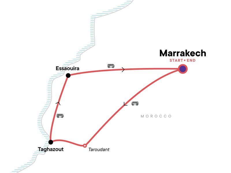 Your First Night Out Moment: Connect With New Friends. Surf lesson in Taghazout. Sunset beach bonfire. Essaouira orientation walk. All transport between destinations and to/from included activities.