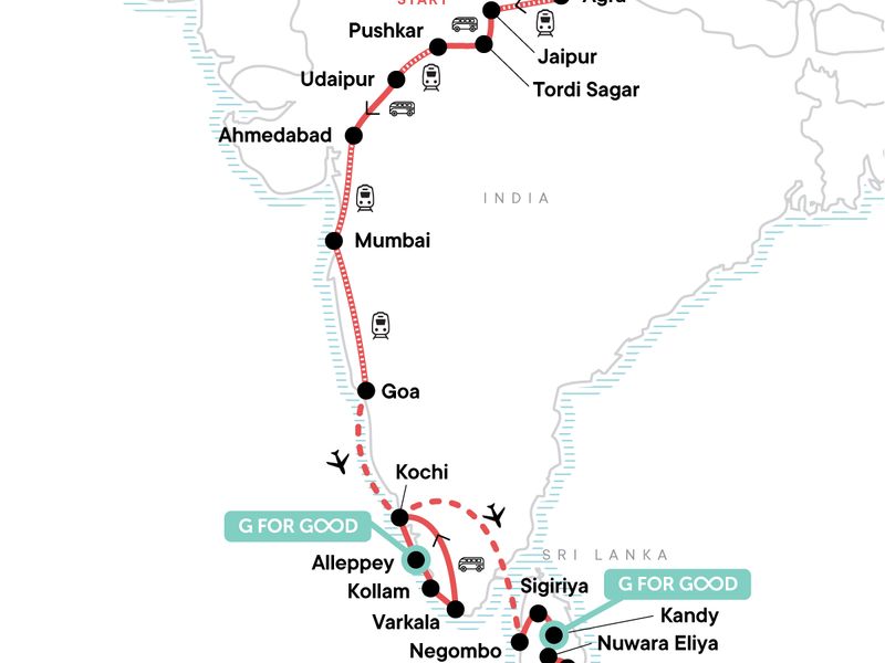 Your Big Night Out Moment: Hikkaduwa Beach Bar, Hikkaduwa. Entrance and guided tour of the Taj Mahal. Rural Tordi Sagar tour with local guide. Allepey Homestay. Sunrise at Savitri Temple. Gandhi Ashram visit. Morning ferry cruise on Alleppey's backwaters. Neendakara Fishing Harbour visit. Orientation walks in Jaipur, Pushkar, Udaipur, Mumbai, Kochi, and Kollam. Internal flights. Spice plantation visit. Kandyan cultural dance performance. Temple of the Tooth visit. Tea plantation visit. Little Adam's Peak Trek. Udawalawe NP safari. Galle City and Fort tour. All transport between destinations and to/from included activities.