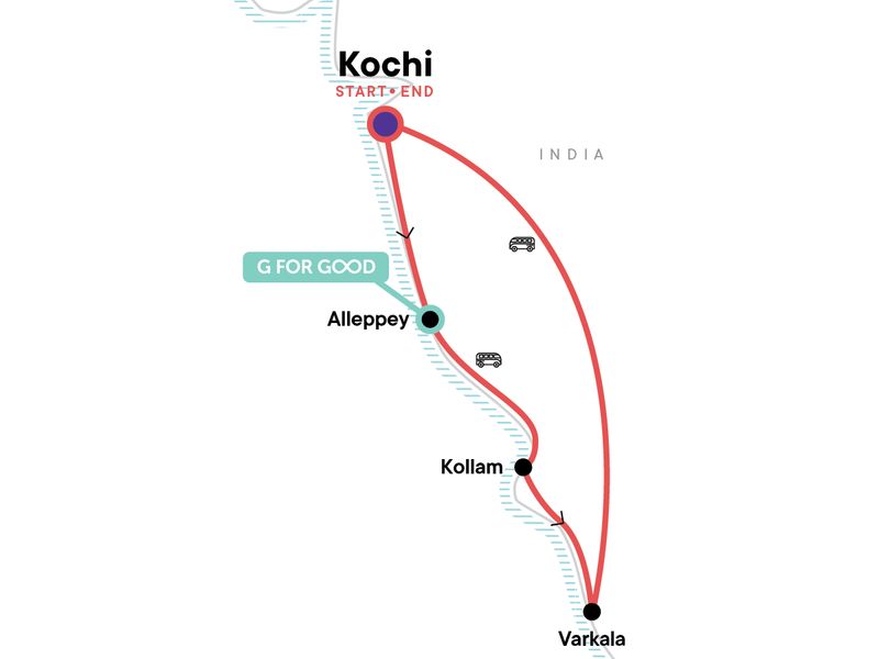 Your Big Night Out Moment: Kochi Nightlife, Kochi. Orientation walks in Alleppey, Kollam, and Fort Kochi. Morning ferry cruise on Alleppey's backwaters. All transport between destinations and to/from included activities.