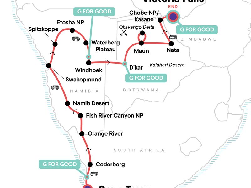 4. LUGGAGE COMPLICATIONS: It occasionally happens that luggage on international flights into Cape Town, Victoria Falls or Johannesburg does not arrive. Please be aware that this may happen, especially if you have a tight connection in either of these centers, are flying with different airlines with a connection, have a last minute flight change or re-route, or fly from or connect through another African centre. Please be prepared and keep all important documentation and valuables on your person. As well we recommend a change of clothes in your hand luggage. If unfortunately, this does happen, and your luggage does not arrive, you should be entitled to a limited initial compensation from your airline. In Southern Africa, the arrival of lost luggage normally takes between 10 and 48 hours after the initial plane’s arrival. The airlines technically should be responsible to forward your luggage to you, to your hotel or elsewhere in Southern Africa. You may find that your tour will begin, and you still have not received your luggage. When reporting your missing bag at the airport please provide the airline with the emergency telephone number of our local office in South Africa (+27 71 470 6928). Please do not give out any address (starting point hotel) as on most trips we do not stay long enough for the bag to arrive, the airline should phone our local office to arrange the 1. Please note that this tour combines with other G Adventures tours. As such, the staff and some travel companions on your tour may have previously been traveling together with G Adventures, prior to Day 1 of your tour. Likewise, some staff and travel companions may be continuing together on another G Adventures tour, after your trip concludes
