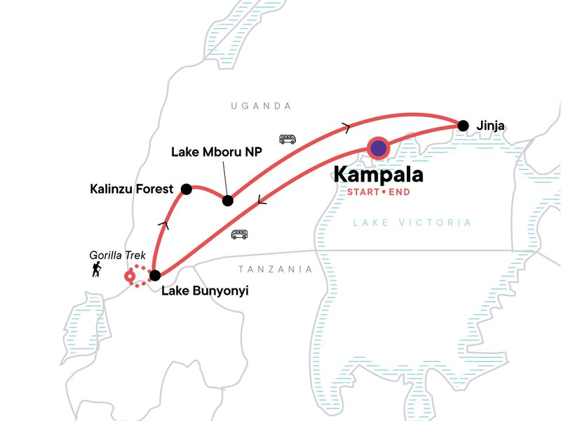 Your Discover Moment: Jinja. Guided mountain gorilla trek with permits. Entrance and chimpanzee tracking in Kalinzu Forest Reserve. Tea plantation visit. All transport between destinations and to/from included activities.