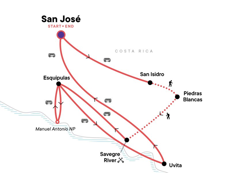 Your Foodie Moment: Chocolate Making, Piedras Blancas. Hiking excursion to Piedras Blancas (4 days). Whitewater rafting on the Savegre River. Trapiche demonstration. Ballena Marine National Park visit. Manuel Antonio National Park Entrance. Free time in Esquipulas and Uvita. All transport between destinations and to/from included activities.