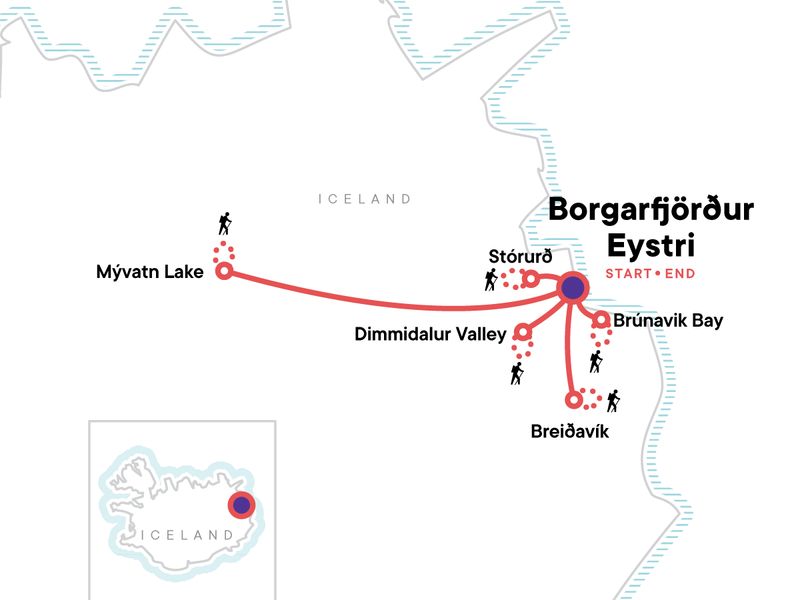 Your Welcome Moment: Meet Your CEO and Group. Borgarfjörður eystri Village Walk and Valley Hike. Stórurð Hike. Dettifoss Waterfall Visit. Leirhnjúkur Lava Fields Hike. Visit Hverir and Myvatn Geothermal sites. Moors and Breiðavík area Hike. Borgarfjörður Harbour Visit. Brúnavík area Hike. Seyðisfjörður Village Walk. All transport between destinations and to/from included activities.