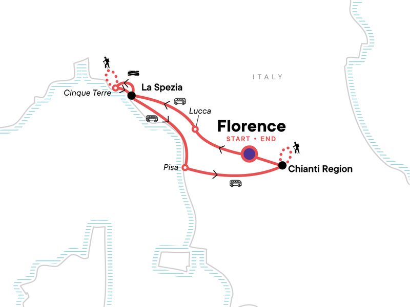 Your Welcome Moment: Welcome Moment - Meet Your CEO and Group. Guided walking tour of Florence. Visit to Cinque Terre National Park. Lucca Guided Walking Tour. Wine tasting at agriturismo. Free time in Cinque Terre and in the Chianti Region. All transport between destinations and to/from included activities.
