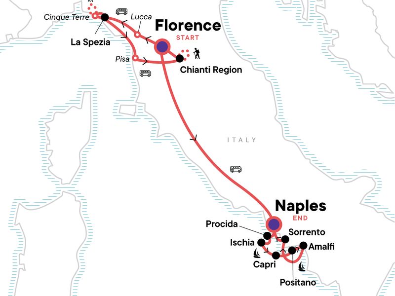 Take a guided walking tour through the art-filled streets of Florence, Hike the dramatic coastal trails of Cinque Terre, Snap a photo with the iconic leaning tower of Pisa, Spend two nights soaking up the beauty of the Tuscan countryside, Explore the cliffside charm of Capri and Positano, Sail the turquoise waters of the Tyrrhenian Sea past volcanic coastlines