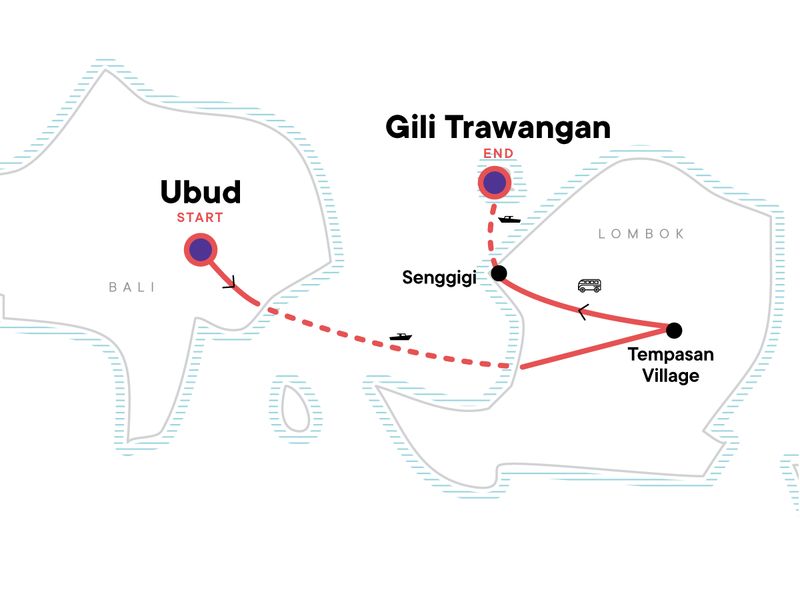 Your Big Night Out Moment: in Gili Trawangan, Gili Trawangan. Free time to explore Ubud. Rice terrace & village walk. Pringgasela weaving village visit. Traditional loom demonstration. Afternoon tea at Aranka homestay. Bonjeruk Village immersion experience. Gili Trawangan 3-Island Snorkeling Tour. All transport between destinations and to/from included activities.