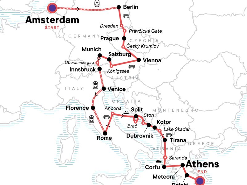 Cruise along the canals in Amsterdam on a bike tour, Hike in the Italian alps, Sample delicious local food in Rome and Venice, Visit local markets in Florence, Take a scenic drive along Kotor Bay, Explore Tirana on a guided tour, Walk to Kotor fortress at sunrise, Visit the magnificent Monasteries in Meteora, Embark on a highlights walk of Athens, Enjoy orientation walks and free time for optional activities in the major cities.