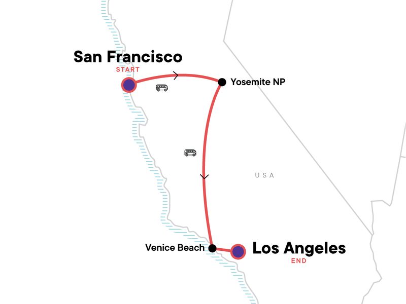 Your Welcome Moment: Welcome Moment - Meet Your CEO and Group. Stop at a farmer’s market in the Central Valley. Yosemite National Park visit. Nevada and Vernal Fall hike. Tuolumne Grove of Giant Sequoias. Surf lesson in southern California. Entrance fees to all national parks and monuments with hiking and walking excursions. Self-inflating mattresses and dome tents. All transport between destinations and to/from included activities.