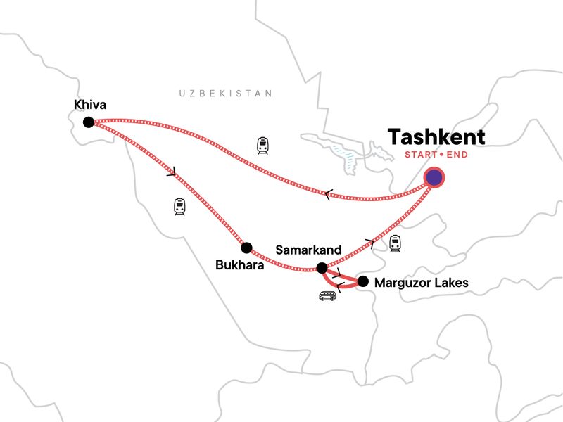 Wander the ancient streets of Khiva — a UNESCO-listed Silk Road city frozen in time, Hike to six of the seven stunning Marguzor Lakes in Tajikistan’s rugged countryside, Get a feel for modern life in historic cities like Tashkent and Bukhara, Travel along the legendary Silk Road and experience its cultural echoes today