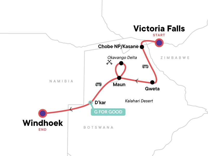 Meet the Naro San people on the fringes of the Kalahari Desert, Get into the wild with traditional canoe rides and wilderness camping in the Okavango Delta, Cruise the Chobe River at sunset, View the mighty Victoria Falls