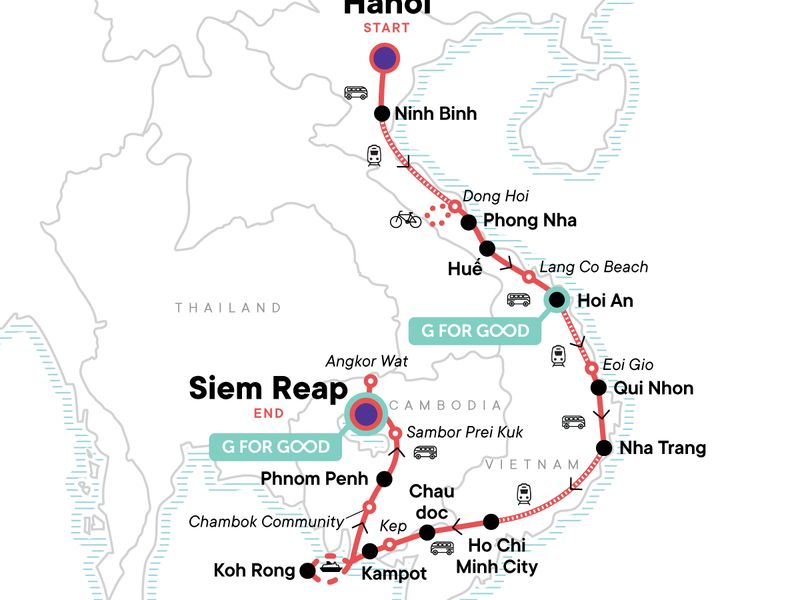 Enjoy time to see all sides of the magical city of Hanoi, Sample Oodles of Noodles in Hoi An and Beers in Hanoi, See it sights of Phnom Penh on an epic cyclo-tour, Swim in crystal clear water and enjoy a beer on the beach in Qui Nhon and Koh Rong island, Descend into the remote Vinh Moc Tunnels, Explore the Mekong Delta Hang Cave Pagoda by motorbike and floating markets of by boat