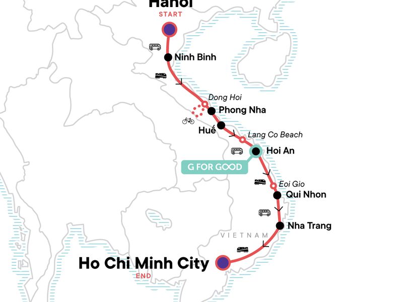 Experience Hanoi as it comes alive at night, Sample Vietnam's tasty local eats and street food, Wander Dong Hoi wet/fish market with a Banh Mi Breakfast in hand, Descend into the less-visited Vinh Moc Tunnels, Free time to hike in Ninh Binh and explore caves in Phong Nha, Hit the beach in Qui Nhon and Nha Trang, Immerse into the hustle and bustle of Ho Chi Minh City.