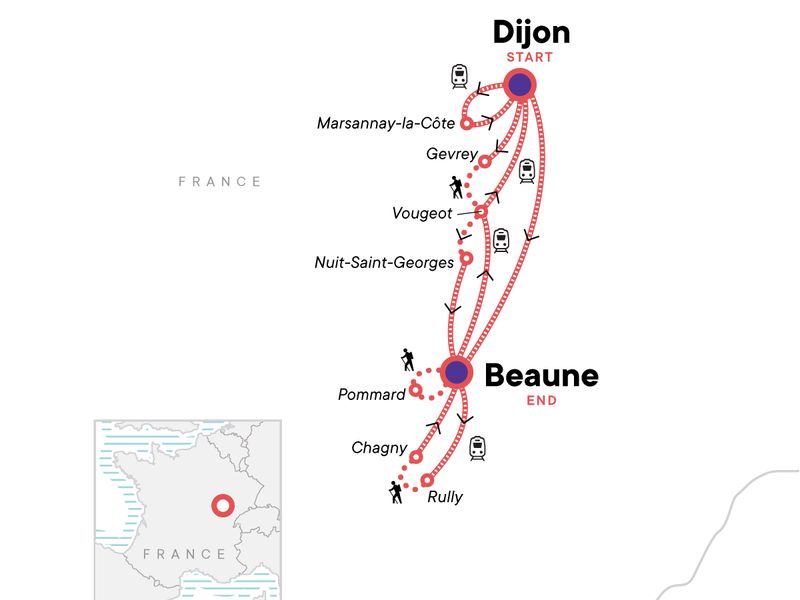 Your Foodie Moment: Château de Marsannay Wine Tasting, Marsannay-la-Côte. Orientation walk and tasting at a local market in Dijon. Walk to the castle in Morsannay-la-Côte. Cellar visit and tasting at Château de Marsannay. CEO-led walk from Gevrey to Vougeot. Self led visit to the Château du Clos de Vougeot. CEO-led walk to and from Pommard. Visit and tasting at the Château de Pommard. Self guided visit at the Hospices de Beaune. CEO-led walk from Vougeot to Nuits Saint Georges. Visit and opportunity for a tasting at Côte de Nuits. CEO-led walk from Rully to Chagney. All transport between destinations and to/from included activities.