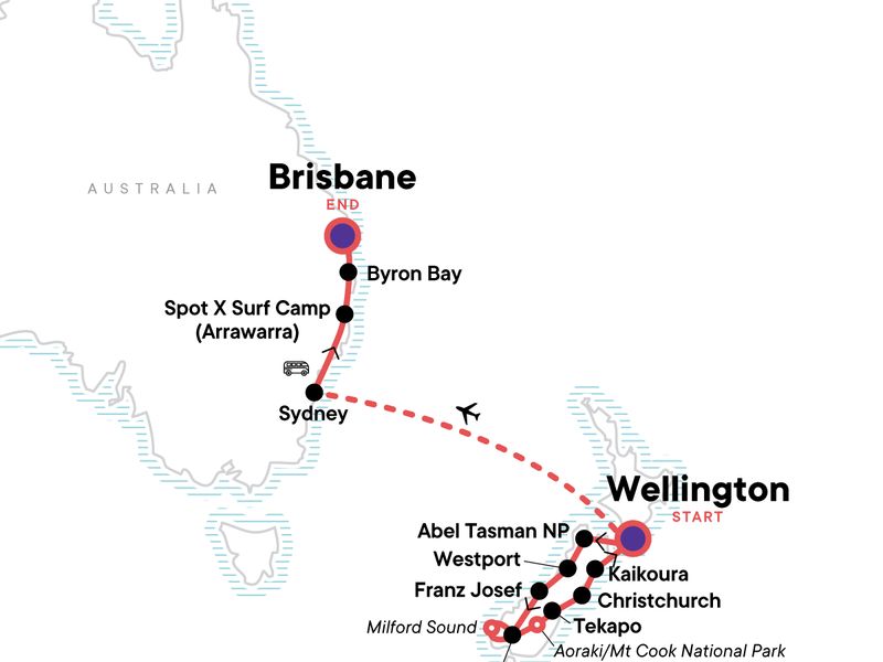 Your Discover Moment: Byron Bay. Boat excursion to Abel Tasman National Park. Walk in Abel Tasman National Park. Seal colony visit. Pancake Rocks. Lake Matheson walk. Aoraki/Mt Cook National Park. Milford Sound day cruise. Lake Tekapo Bike Ride. Ferry to Manly. Sydney orientation walk. Kangaroo Trek. Cape Byron Lighthouse Visit. Daisy Hill Koala Centre. All transport between destinations and to/from included activities