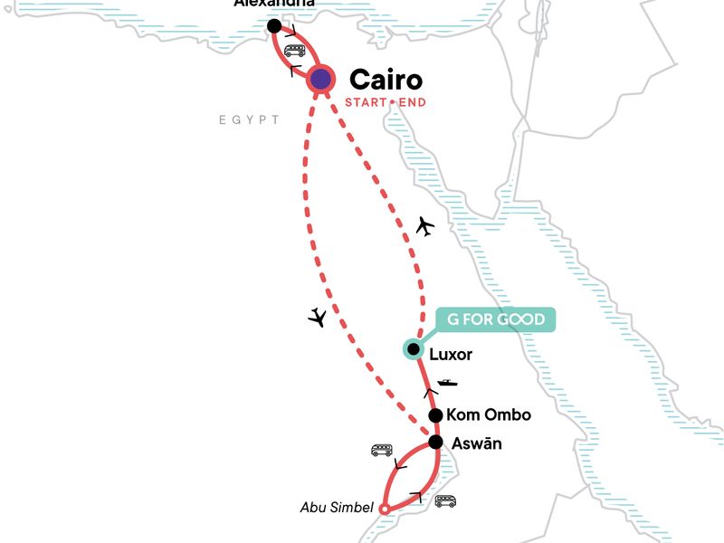 Your Local Living Moment: Lunch with a Local Family, Luxor. Arrival transfer. All entrance fees to included monuments. Guided tour of the Pyramid of Giza and the Sphinx. Visit the Library of Alexandria, catacombs, and Pompey’s Pillar. Guided visit of the Grand Egyptian Museum. Tour of Abu Simbel. Three-night Nile cruise. Tour of Kom Ombo Temple. Visit the Colossi of Memnon. Cycle and Funtasia Project visit. Excursion to the Valley of the Kings, Hatshepsut, Luxor and Karnak Temples. All transport between destinations and to/from included activities.