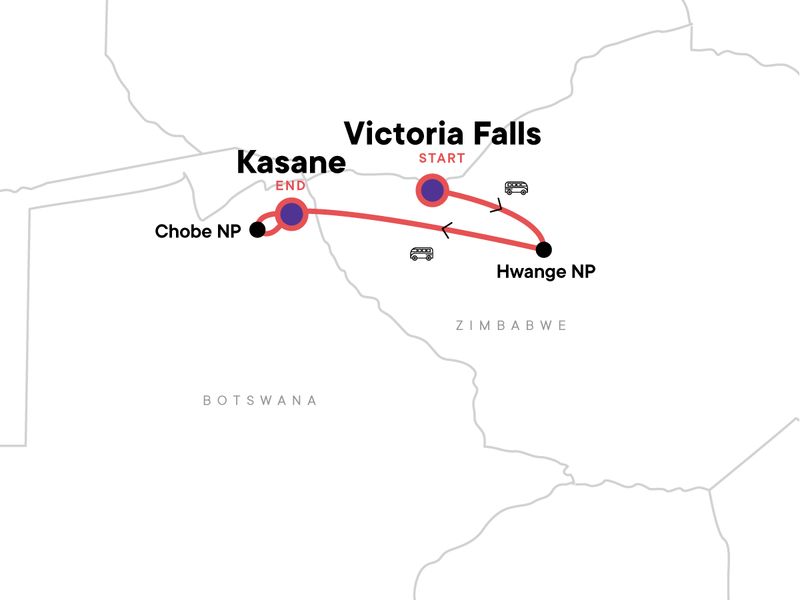 Experience the thundering Victoria Falls with time to explore its breathtaking surroundings, Spot the Big Five in Zimbabwe’s legendary Hwange National Park, Cruise the Chobe River and watch wildlife thrive along its shores, Soak in the untamed beauty of Zimbabwe and Botswana’s wild landscapes