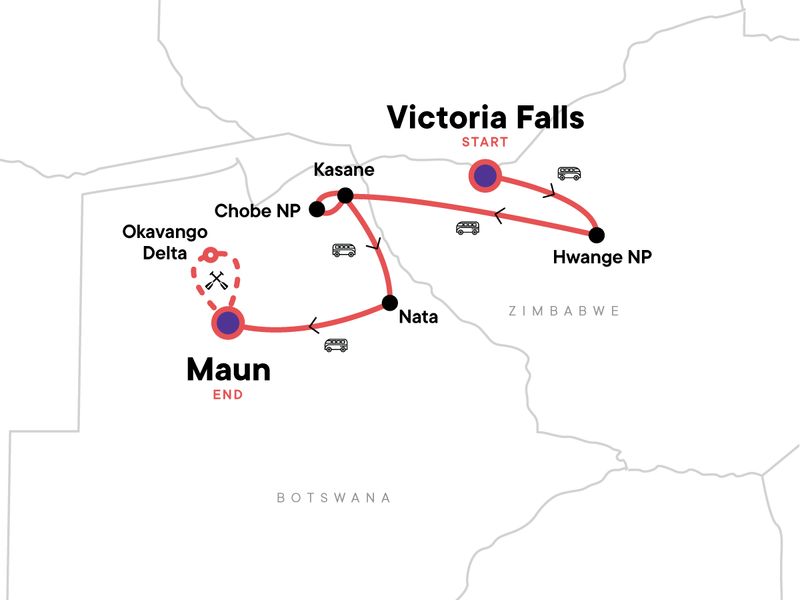 Your Discover Moment: Victoria Falls. Simunye Theatre Show. Painted Dog Rehabilitation and Conservation Centre Tour. Early morning safari drive in Hwange NP. Chobe River Sunset Cruise. Morning safari drive in Chobe NP. Guided bush walk in Nata. Okavango Delta full-day experience. Free time in Victoria Falls, Hwange, Chobe, Nata, & Maun for optional activities in the area. All transport between destinations and to/from included activities.